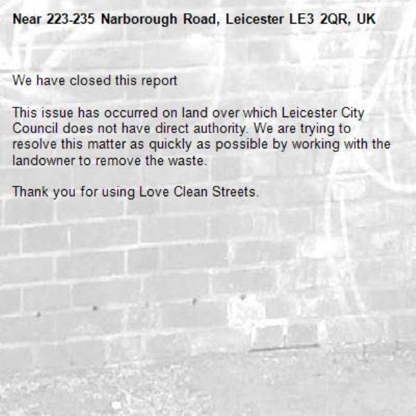 -223-235 Narborough Road, Leicester LE3 2QR, UK 23/02/2026 15:32 We have closed this report This issue has occurred on land over which Leicester City Council does not have direct authority. We are trying to resolve this matter as quickly as possible by working with the landowner to remove the waste. Thank you for using Love Clean Streets.