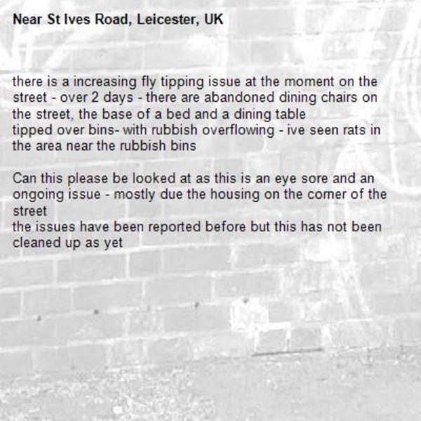 there is a increasing fly tipping issue at the moment on the street - over 2 days - there are abandoned dining chairs on the street, the base of a bed and a dining table<br/>tipped over bins- with rubbish overflowing - ive seen rats in the area near the rubbish bins <br/><br/>Can this please be looked at as this is an eye sore and an ongoing issue - mostly due the housing on the corner of the street <br/>the issues have been reported before but this has not been cleaned up as yet