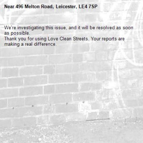 -496 Melton Road, Leicester, LE4 7SP 03/03/2026 10:03 We’re investigating this issue, and it will be resolved as soon as possible. Thank you for using Love Clean Streets. Your reports are making a real difference.