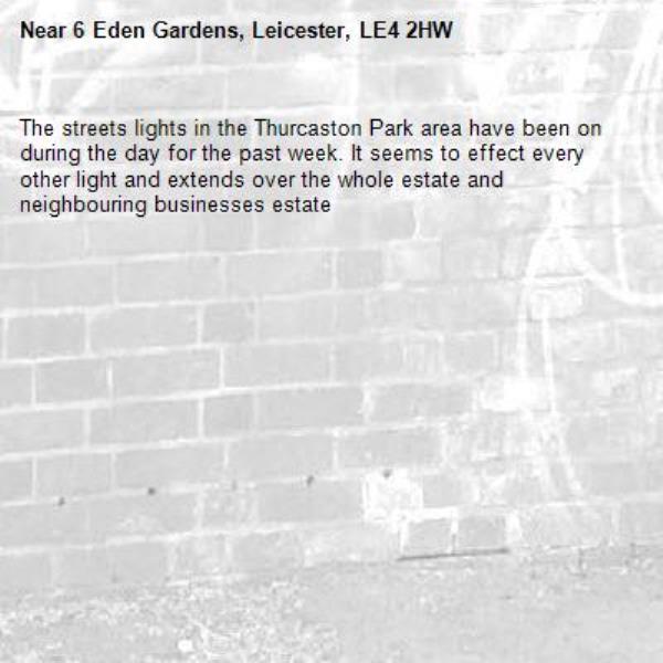 The streets lights in the Thurcaston Park area have been on during the day for the past week. It seems to effect every other light and extends over the whole estate and neighbouring businesses estate