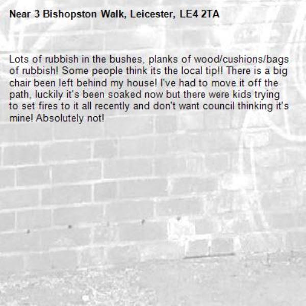 Lots of rubbish in the bushes, planks of wood/cushions/bags of rubbish! Some people think its the local tip!! There is a big chair been left behind my house! I've had to move it off the path, luckily it's been soaked now but there were kids trying to set fires to it all recently and don't want council thinking it's mine! Absolutely not!