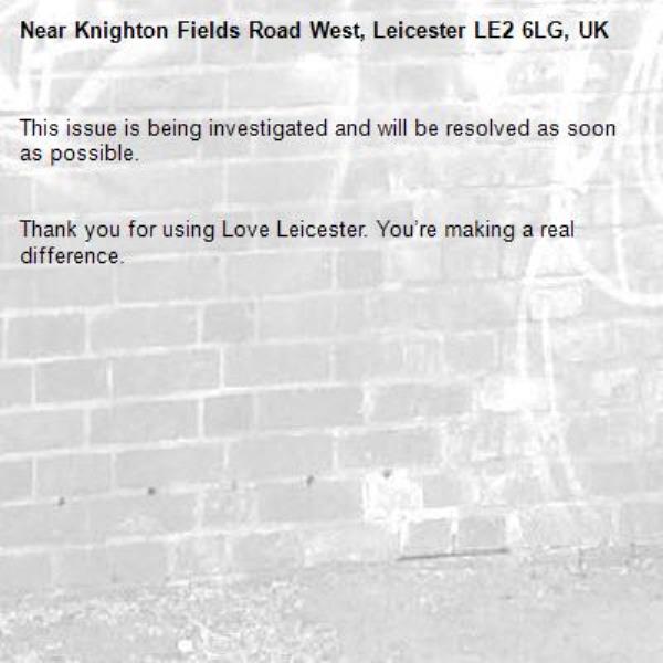 -Knighton Fields Road West, Leicester LE2 6LG, UK 03/03/2026 15:14 This issue is being investigated and will be resolved as soon as possible. Thank you for using Love Leicester. You’re making a real difference.