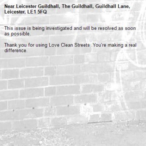 -Leicester Guildhall, The Guildhall, Guildhall Lane, Leicester, LE1 5FQ 22/12/2025 10:40 This issue is being investigated and will be resolved as soon as possible. Thank you for using Love Clean Streets .You’re making a real difference.