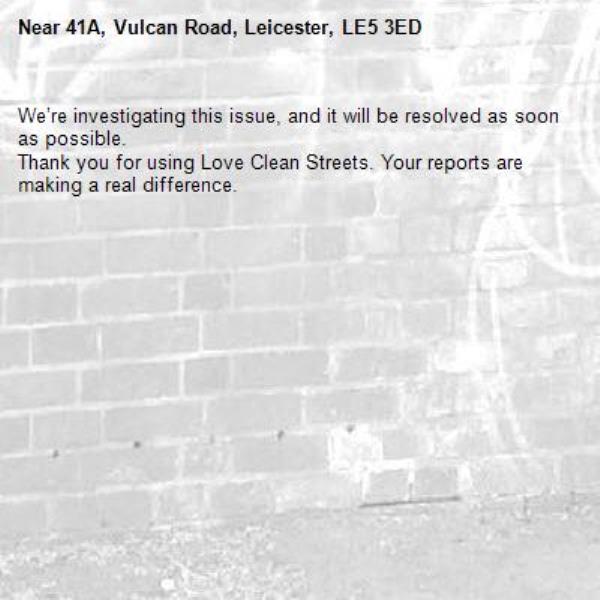 -41A, Vulcan Road, Leicester, LE5 3ED 16/03/2026 11:01 We’re investigating this issue, and it will be resolved as soon as possible. Thank you for using Love Clean Streets. Your reports are making a real difference.