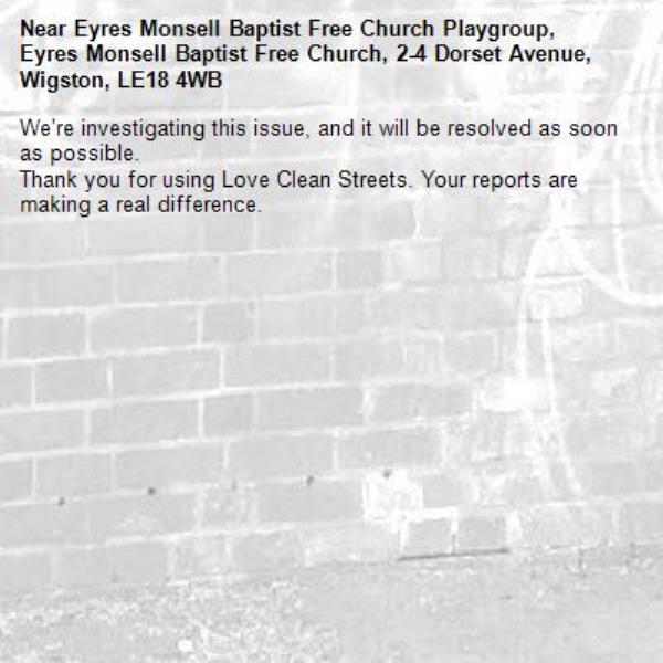 -Eyres Monsell Baptist Free Church Playgroup, Eyres Monsell Baptist Free Church, 2-4 Dorset Avenue, Wigston, LE18 4WB 27/03/2026 07:46 We’re investigating this issue, and it will be resolved as soon as possible. Thank you for using Love Clean Streets. Your reports are making a real difference.