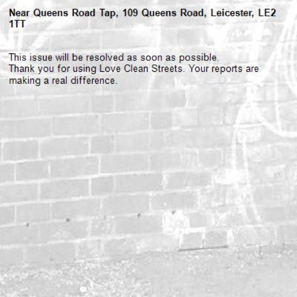 -Queens Road Tap, 109 Queens Road, Leicester, LE2 1TT 02/03/2026 07:23 This issue will be resolved as soon as possible. Thank you for using Love Clean Streets. Your reports are making a real difference.