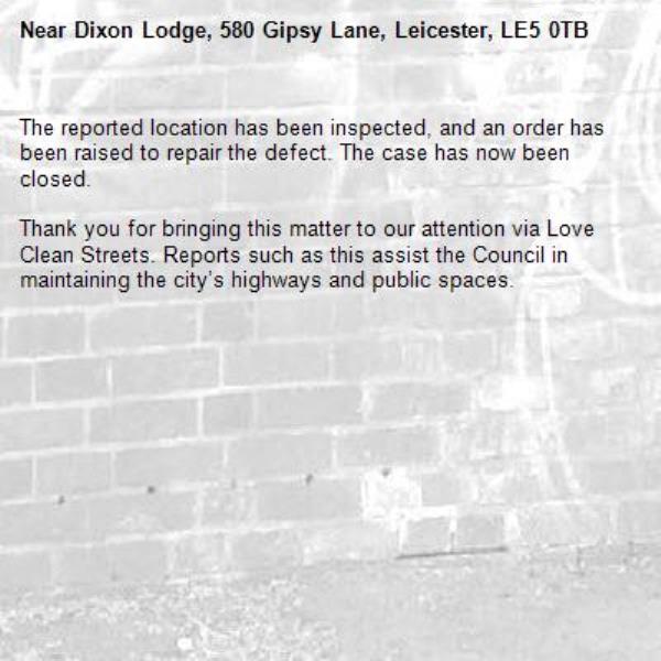 -Dixon Lodge, 580 Gipsy Lane, Leicester, LE5 0TB 13/03/2026 12:02 The reported location has been inspected, and an order has been raised to repair the defect. The case has now been closed. Thank you for bringing this matter to our attention via Love Clean Streets. Reports such as this assist the Council in maintaining the city’s highways and public spaces.