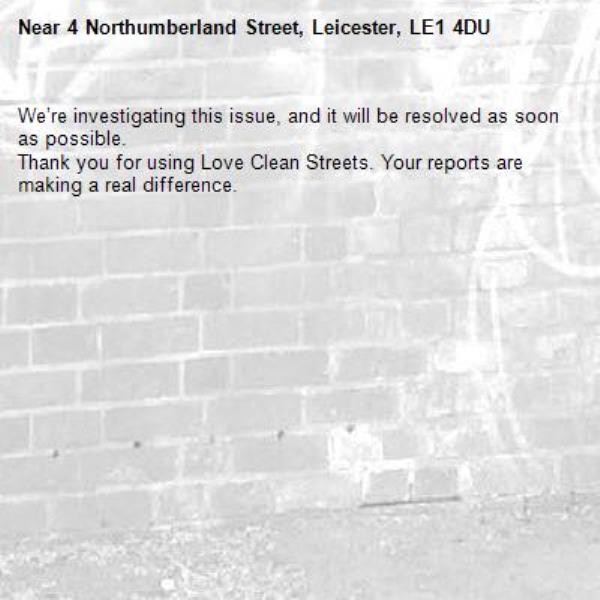 -4 Northumberland Street, Leicester, LE1 4DU 12/11/2025 13:51 We’re investigating this issue, and it will be resolved as soon as possible. Thank you for using Love Clean Streets. Your reports are making a real difference.