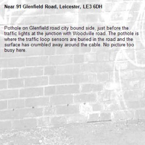 Pothole on Glenfield road city bound side, just before the traffic lights at the junction with Woodville road. The pothole is where the traffic loop sensors are buried in the road and the surface has crumbled away around the cable. No picture too busy here.
