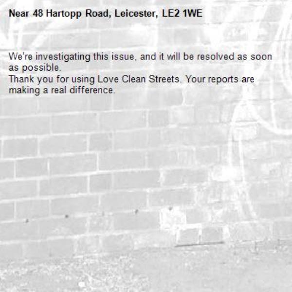 -48 Hartopp Road, Leicester, LE2 1WE 30/01/2026 12:18 We’re investigating this issue, and it will be resolved as soon as possible. Thank you for using Love Clean Streets. Your reports are making a real difference.
