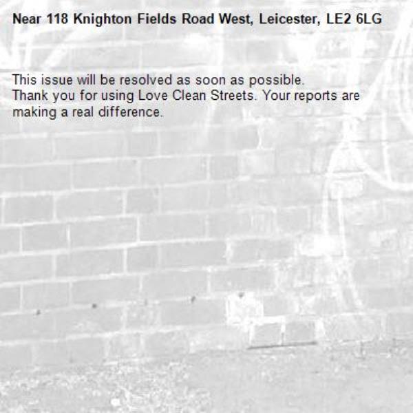 -118 Knighton Fields Road West, Leicester, LE2 6LG 01/04/2026 11:45 This issue will be resolved as soon as possible. Thank you for using Love Clean Streets. Your reports are making a real difference.