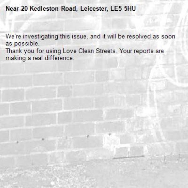 -20 Kedleston Road, Leicester, LE5 5HU 28/10/2025 11:35 We’re investigating this issue, and it will be resolved as soon as possible. Thank you for using Love Clean Streets. Your reports are making a real difference.