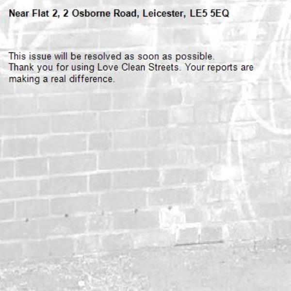 -Flat 2, 2 Osborne Road, Leicester, LE5 5EQ 23/01/2026 10:26 This issue will be resolved as soon as possible. Thank you for using Love Clean Streets. Your reports are making a real difference.