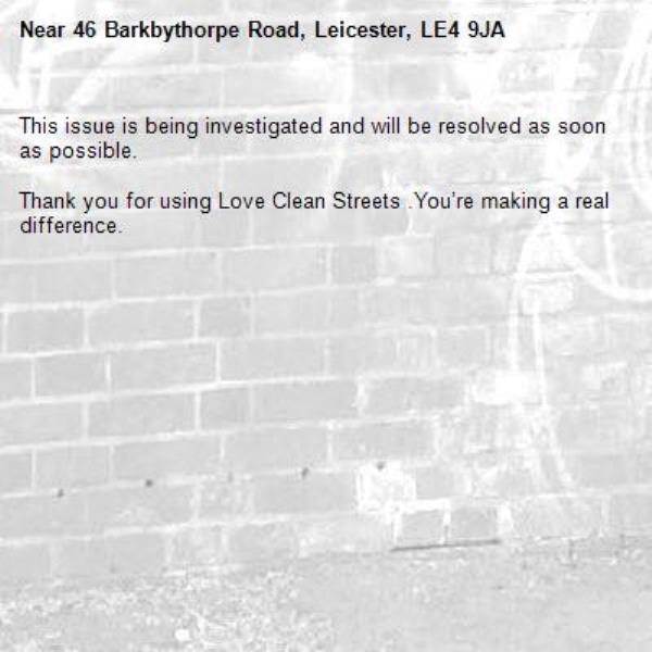 -46 Barkbythorpe Road, Leicester, LE4 9JA 15/01/2026 14:42 This issue is being investigated and will be resolved as soon as possible. Thank you for using Love Clean Streets .You’re making a real difference.