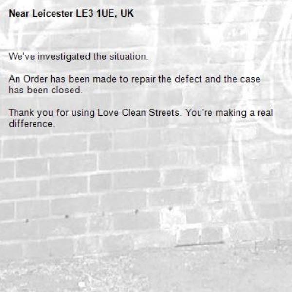 -Leicester LE3 1UE, UK 24/02/2026 13:44 We’ve investigated the situation. An Order has been made to repair the defect and the case has been closed. Thank you for using Love Clean Streets. You’re making a real difference.