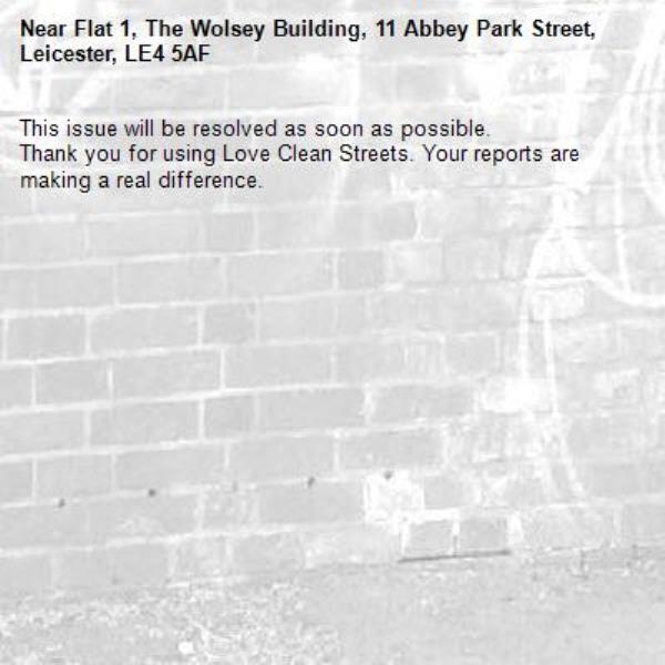 -Flat 1, The Wolsey Building, 11 Abbey Park Street, Leicester, LE4 5AF 17/12/2025 08:44 This issue will be resolved as soon as possible. Thank you for using Love Clean Streets. Your reports are making a real difference.