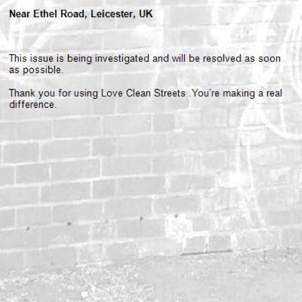 -Ethel Road, Leicester, UK 23/02/2026 12:56 This issue is being investigated and will be resolved as soon as possible. Thank you for using Love Clean Streets .You’re making a real difference.