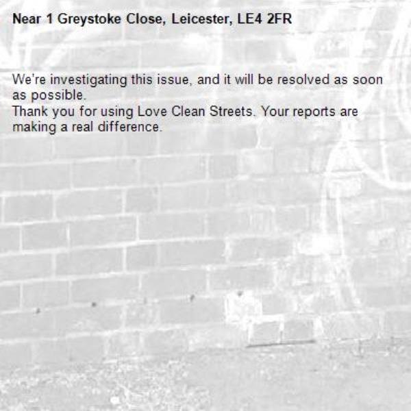 -1 Greystoke Close, Leicester, LE4 2FR 27/11/2025 13:47 We’re investigating this issue, and it will be resolved as soon as possible. Thank you for using Love Clean Streets. Your reports are making a real difference.