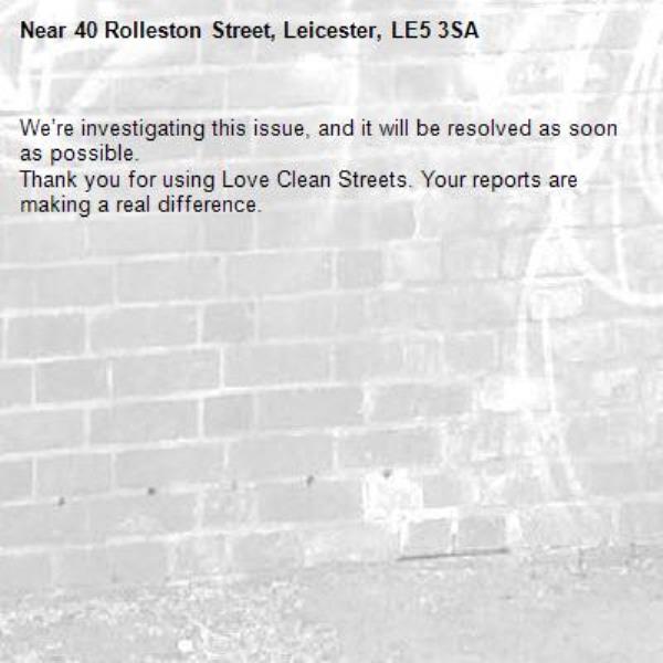 -40 Rolleston Street, Leicester, LE5 3SA 27/02/2026 08:22 We’re investigating this issue, and it will be resolved as soon as possible. Thank you for using Love Clean Streets. Your reports are making a real difference.