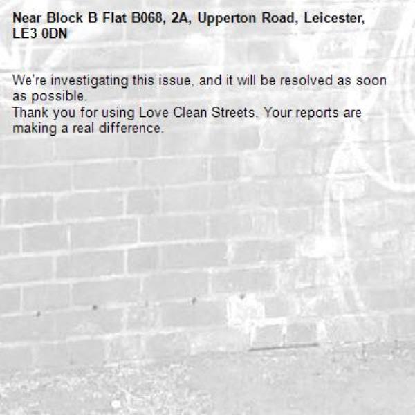 -Block B Flat B068, 2A, Upperton Road, Leicester, LE3 0DN 16/03/2026 13:30 We’re investigating this issue, and it will be resolved as soon as possible. Thank you for using Love Clean Streets. Your reports are making a real difference.