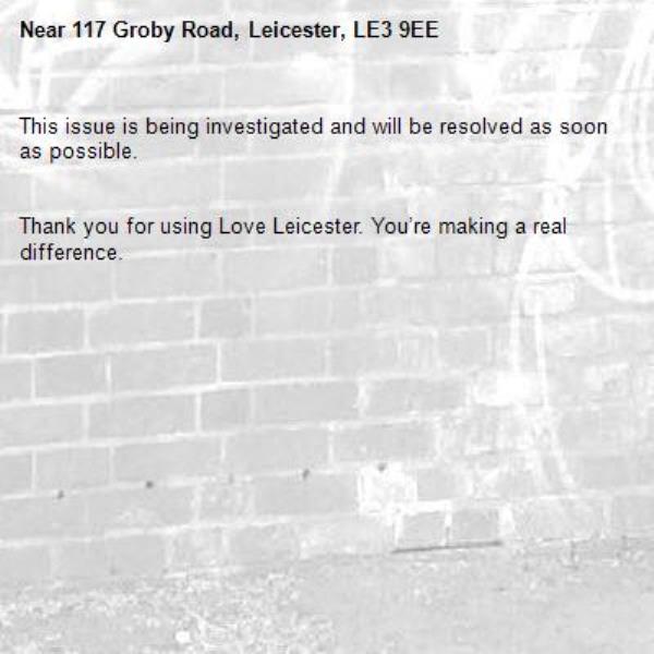 -117 Groby Road, Leicester, LE3 9EE 13/04/2026 13:24 This issue is being investigated and will be resolved as soon as possible. Thank you for using Love Leicester. You’re making a real difference.
