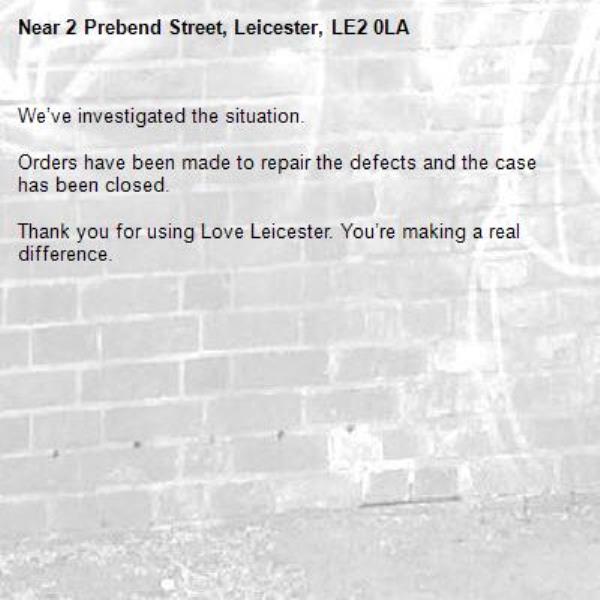 -2 Prebend Street, Leicester, LE2 0LA 28/04/2026 15:20 We’ve investigated the situation. Orders have been made to repair the defects and the case has been closed. Thank you for using Love Leicester. You’re making a real difference.