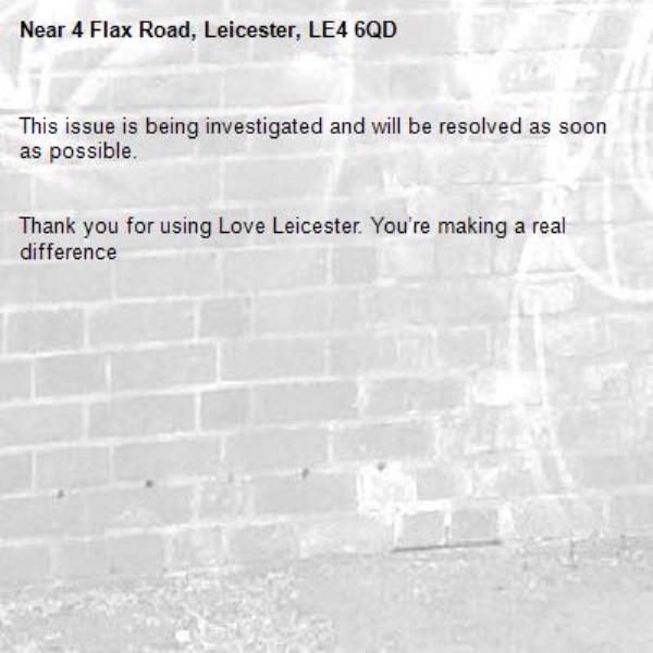 -4 Flax Road, Leicester, LE4 6QD 25/04/2026 12:17 This issue is being investigated and will be resolved as soon as possible. Thank you for using Love Leicester. You’re making a real difference