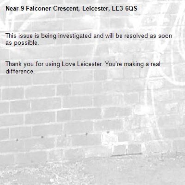 Street light has not worked for over a week in between 7-9 falconer crescent Leicester my son is visually impaired and it’s dangerous and dark