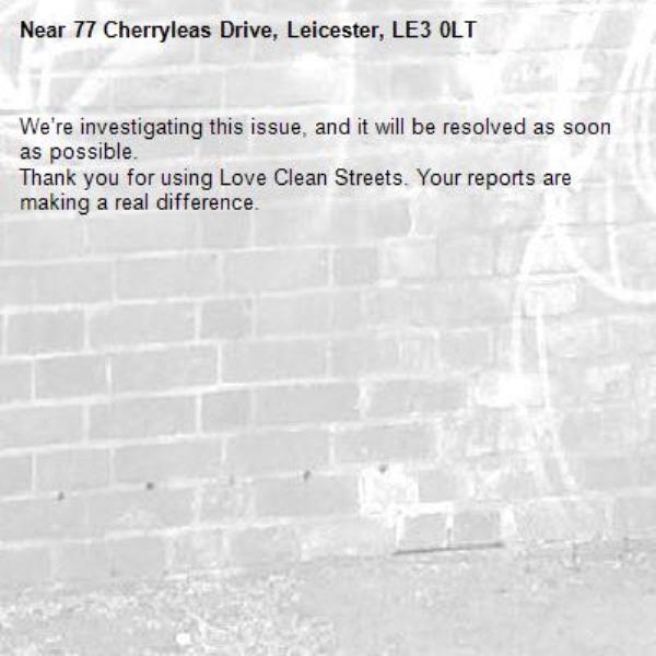 -77 Cherryleas Drive, Leicester, LE3 0LT 20/03/2026 07:34 We’re investigating this issue, and it will be resolved as soon as possible. Thank you for using Love Clean Streets. Your reports are making a real difference.