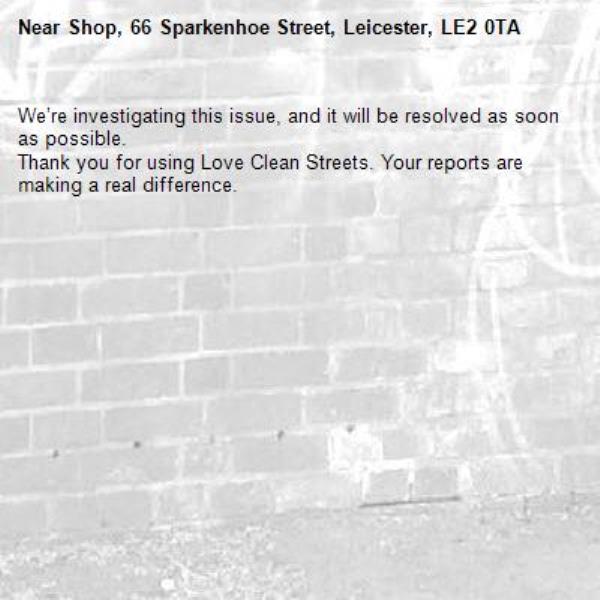 -Shop, 66 Sparkenhoe Street, Leicester, LE2 0TA 04/12/2025 10:26 We’re investigating this issue, and it will be resolved as soon as possible. Thank you for using Love Clean Streets. Your reports are making a real difference.