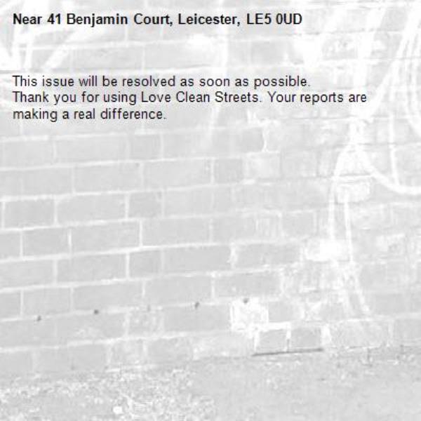 -41 Benjamin Court, Leicester, LE5 0UD 31/03/2026 07:37 This issue will be resolved as soon as possible. Thank you for using Love Clean Streets. Your reports are making a real difference.