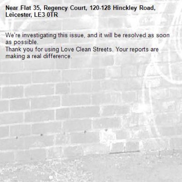-Flat 35, Regency Court, 120-128 Hinckley Road, Leicester, LE3 0TR 26/02/2026 09:19 We’re investigating this issue, and it will be resolved as soon as possible. Thank you for using Love Clean Streets. Your reports are making a real difference.