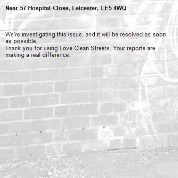 -57 Hospital Close, Leicester, LE5 4WQ 12/03/2026 12:58 We’re investigating this issue, and it will be resolved as soon as possible. Thank you for using Love Clean Streets. Your reports are making a real difference.