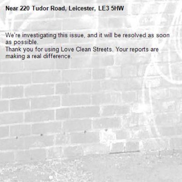 -220 Tudor Road, Leicester, LE3 5HW 25/11/2025 08:21 We’re investigating this issue, and it will be resolved as soon as possible. Thank you for using Love Clean Streets. Your reports are making a real difference.