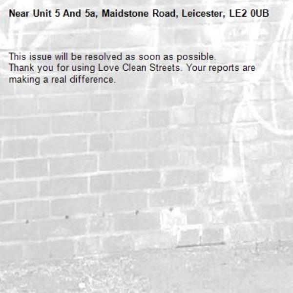 -Unit 5 And 5a, Maidstone Road, Leicester, LE2 0UB 19/04/2026 16:44 This issue will be resolved as soon as possible. Thank you for using Love Clean Streets. Your reports are making a real difference.