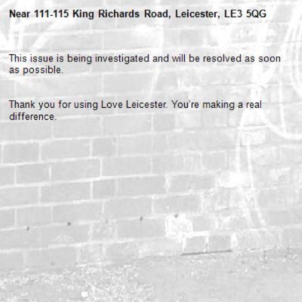 -111-115 King Richards Road, Leicester, LE3 5QG 21/02/2026 13:46 This issue is being investigated and will be resolved as soon as possible. Thank you for using Love Leicester. You’re making a real difference.